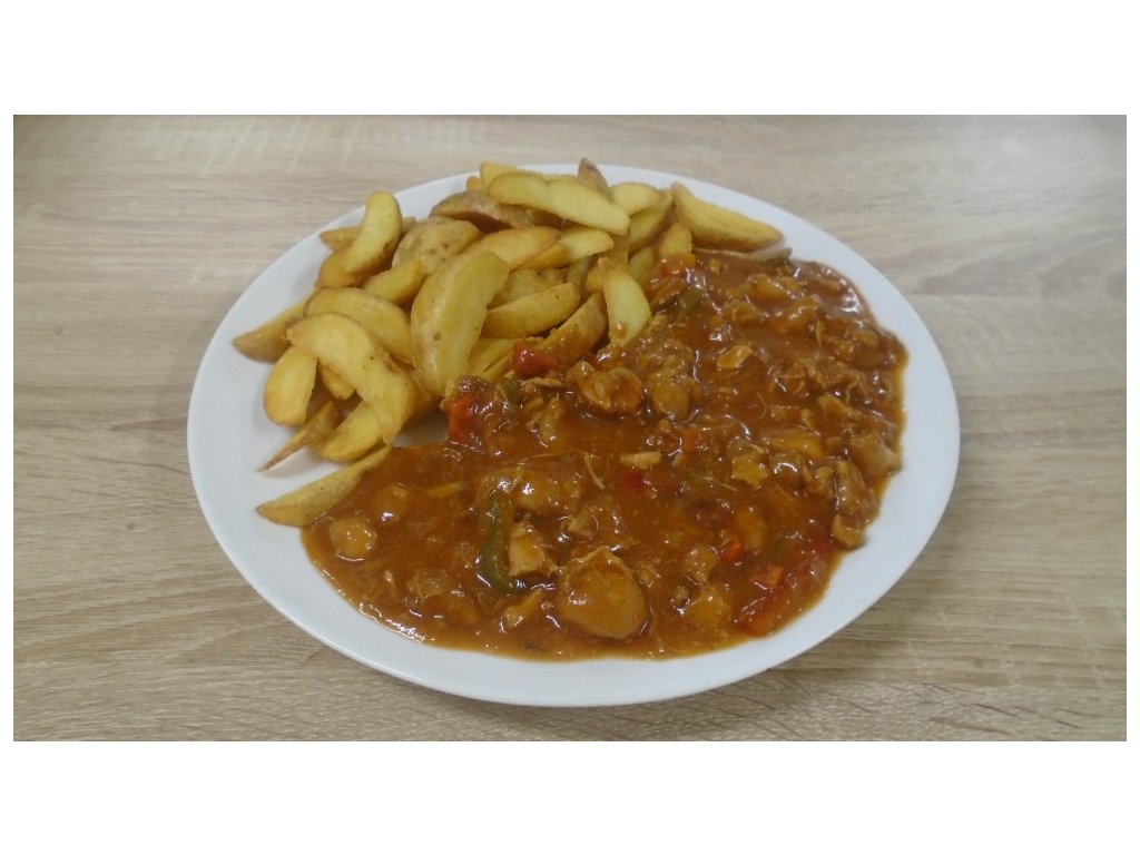 Složení: kuřecí prsní řízky, paprika proužky mix, olej, rajčatový protlak, mouka, bujon, česneková pasta, sůl, pepř, chilli, brambory.