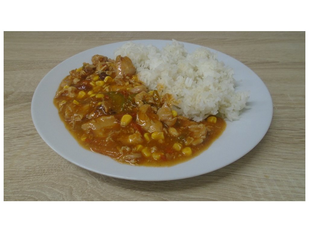 Složení: kuřecí prsní řízky, kukuřice, fazole sterilovaná, paprika mix proužky, rajčatový protlak, cibule, rýže jasmínová, olej, paprika chili mletá, sůl.