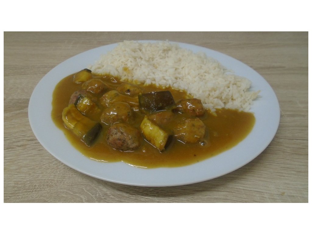 Masové kuličky v kari omáčce s lilkem, jasmínová rýže 620g MRAŽENÉ