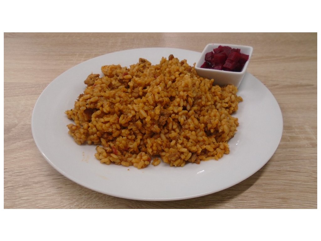Složení: kuřecí prsní řízky, rýže, rajčatový protlak, rajčata drcená, sýr Eidam 30%, cibule, olej, bazalka, pepř, sůl.