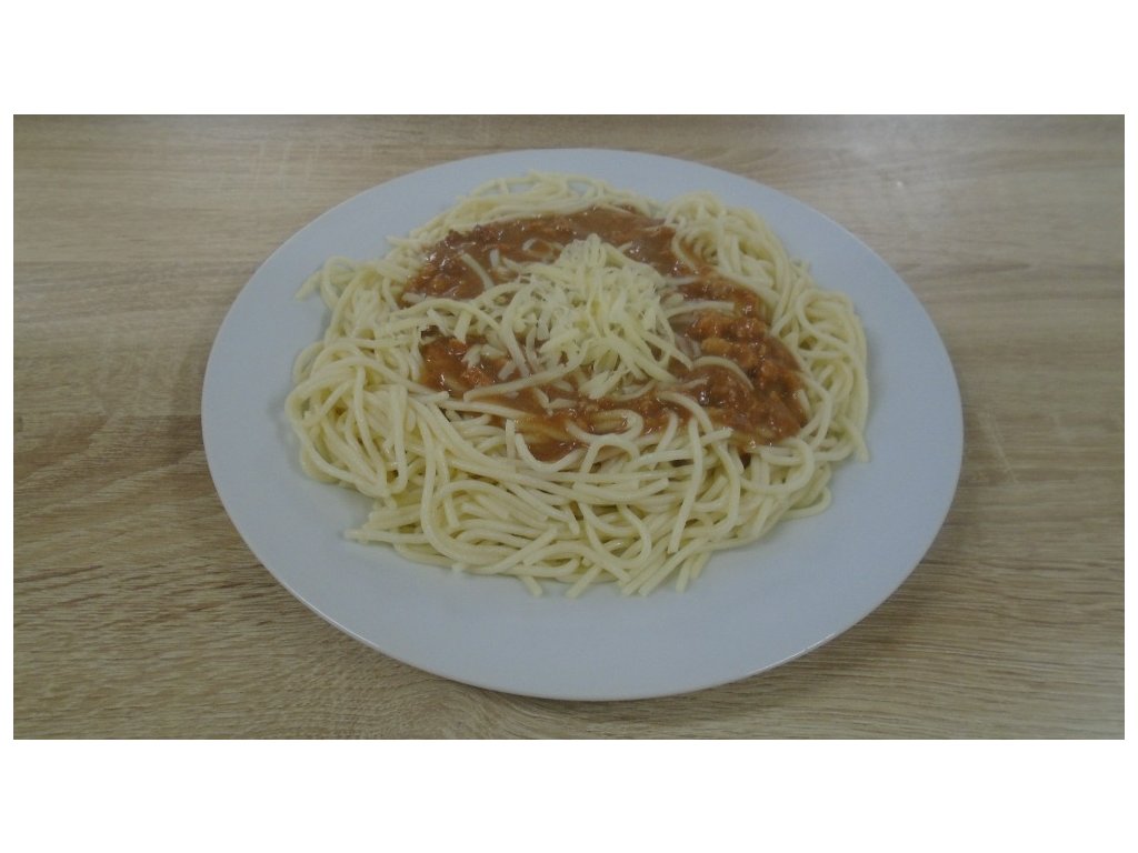 Složení: těstoviny špagety, vepřová plec, hovězí zadní ořech, mouka, olej, Eidam sýr 30%, rajčatový protlak, kečup, bujon, sůl.