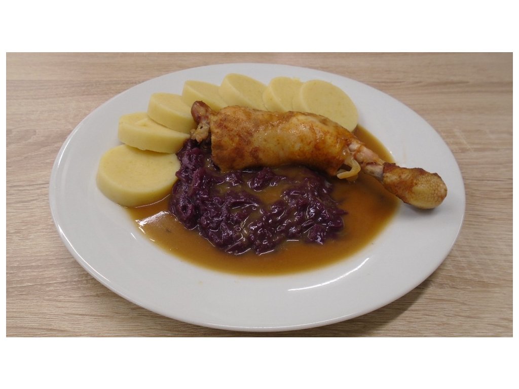 Složení: kuřecí stehna uzená, mouka, olej, vývar, sůl, pepř, knedlík bramborový, zelí červené, cukr krystal, cibule, mouka, kmín drcený.
