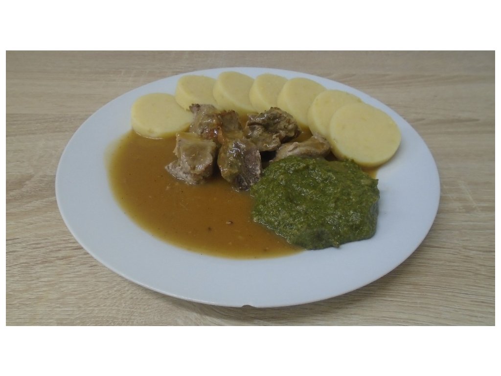 Vepřové špalíčky na česneku, bramborový knedlík, špenát 460g MRAŽENÉ