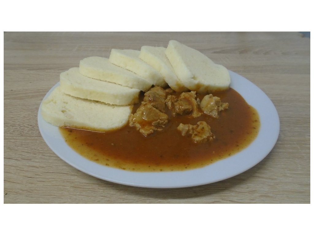 Složení: vepřová plec, cibule, mouka hladká, olej, česneková pasta, bujón, majoránka, pepř, paprika mletá, , sůl, sójová omáčka, houskový knedlík.
