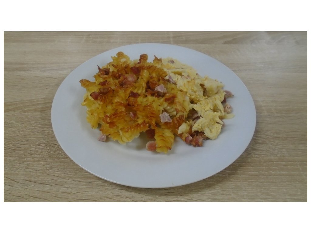 Složení: těstoviny, uzené maso kousky, vaječná melanž, mléko, olej, sůl, pepř.